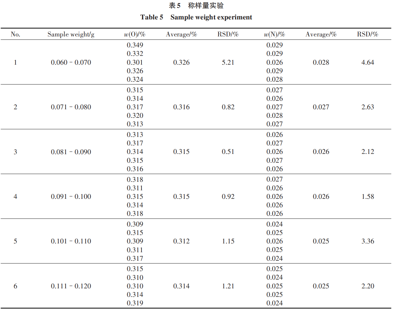 As shown by the data in the table, the sample analysis results fluctuate within the acceptable range, with an RSD < 6% for O and an RSD < 10% for N; the method meets the requirements for analytical testing [24].