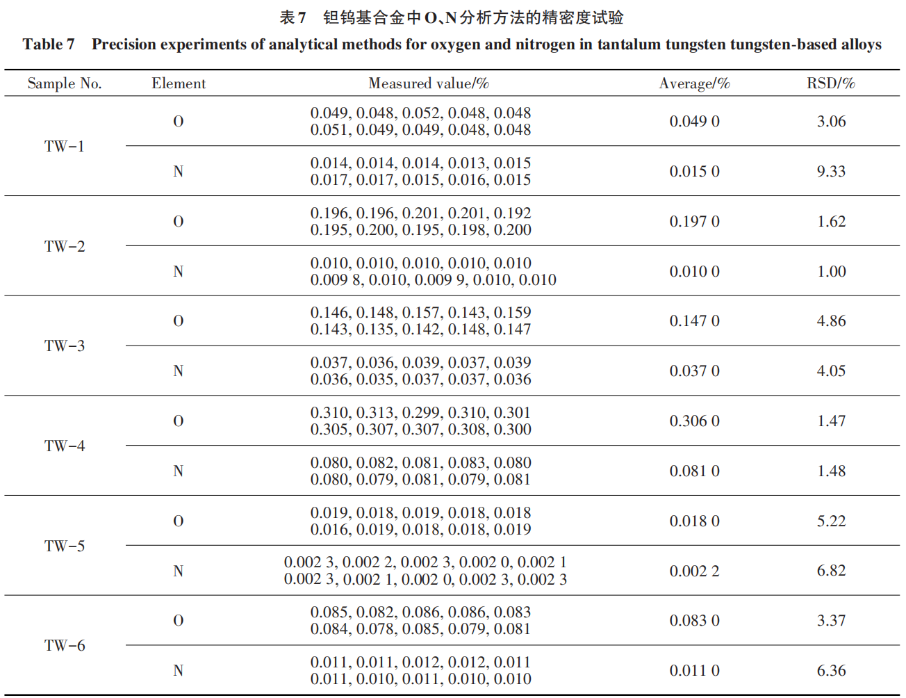 Under the selected analytical conditions, the tantalum-tungsten-based alloy samples submitted for analysis were tested in duplicate; the results are shown in Table 7.