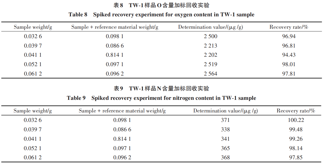 The data in the tables show that the recovery rates for O range from 94.43% to 98.01%, and those for N range from 97.85% to 100.22%, indicating that the test results are accurate and reliable.