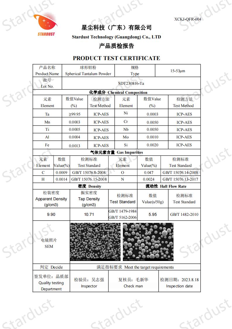 Spherical tantalum powder is prepared by RF plasma spheronization technology, featuring high purity, low oxygen content, high sphericity, smooth surface, no satellites, uniform particle size distribution, excellent flow properties, high bulk density and high vibration density.