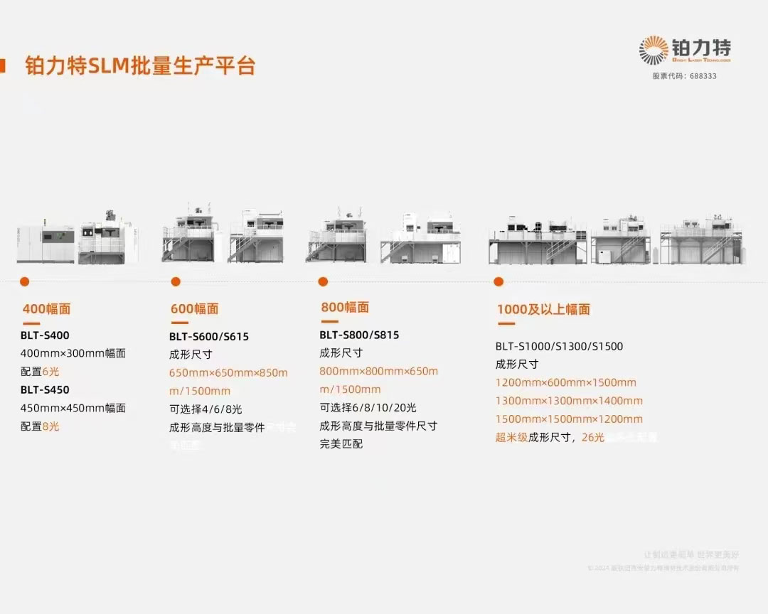 铂力特在多激光设备、大幅面与多激光束的创新以及强大的研发实力方面展示了其卓越的技术和市场领导力。在本次TCT展会上,铂力特展示了多款多激光设备,包括BLT-S400、BLT-S450、BLT-S800 。这些设备在相同幅面内配置了更多的激光器,从而大幅提高了生产效率和产出率,而不增加设备占地面积和操作人员数量。