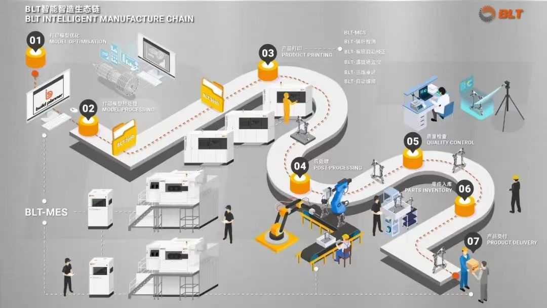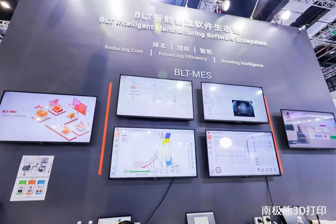 除了铂力特在软件系统方面也做了大量改进,推出了BLT-BP 2.0和BLT-MES系统。这些系统实现了从单台设备监控到工厂级生产线管理的转变,显著提升了3D打印设备的自动化水平和生产效率,有效提高了设备利用率。其中,BLT-BP 2.0系统在操作界面和用户体验方面进行了优化,使得设备操作更加简便直观。而BLT-MES系统则在智能化排产和集中监控方面发挥了重要作用。BLT-MES系统能够对多台设备进行统一管理和调度,实时监控设备状态和生产进度,提高了设备利用率和生产效率。
