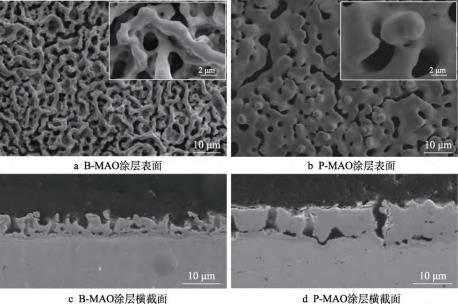B-MAO和P-MAO涂层表面和横截面的微观形貌如图1所示。可以看出,B-MAO表面呈现出“类骨小梁”状多孔特征(见图1a)。“骨小梁”的厚度约为2μm,“骨小梁”状结构之间形成较大尺寸的微米级沟槽(槽宽5~8μm),在沟槽内部还分布着小尺寸的微米级孔洞(孔径在2μm左右)。结合涂层横截面形貌(见图1c)可以看出,涂层内部也存在较多更小尺寸的孔洞,这说明B-MAO涂层在膜厚方向上具有分级结构特征。与之对比,P-MAO涂层表面形貌(见图1b)呈现出典型的“火山坑”状多孔特征,孔的尺寸在3μm左右,有少量孔洞互连后形成沟槽,但相对来说其孔洞的形态和尺寸比较单一。P-MAO横截面形貌(见图1d)则显示出典型的微弧放电通道特征,放电通道以外区域和B-MAO涂层相比,孔洞较少,比较致密。从形貌上看,在纯钽表面利用Na2B4O7电解液获得的MAO涂层的孔隙率要高于利用Na3PO4制备的MAO涂层,出现这样的效果可能与四硼酸盐电解质对涂层微弧放电产物具有较强溶解作用有关[25]。