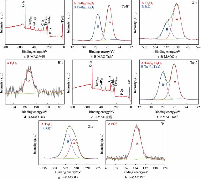 涂层表面的XPS分析结果如图3所示。其中,图3a—d为B-MAO的XPS分析结果,图3a为总谱,图3b、c、d分别为Ta4f、O1s、B1s的详细谱及分峰拟合结果。Ta4f在结合能25.80、27.69eV处存在2个特征峰,自旋分裂轨道为1.9eV,这与Ta5+的Ta4f5/2和Ta4f7/2特征峰吻合,接近Ta2O5的结合能[29],但存在一定程度的偏移(见图3b)。结合能为530.06eV的特征峰则与Ta2O5的O1s结合能一致,证明了涂层表面Ta以Ta2O5的形式存在[30](见图3c)。有研究表明,微弧氧化涂层表面会存在一层非晶层[25],此处,Ta2O5的Ta4f峰位向更高结合能方向产生偏移,可能是涂层表面形成的Ta2O5为非晶态所致[31]。O1s中键能较高的峰位(531.64eV)对应于B2O3[32],B1s峰位(191.52eV)对应的是B2O3,说明在B-MAO涂层中B以B2O3的形式存在(见图3d)。图2中XRD未检测到B2O3衍射峰,推测涂层中B2O3应来自于Na2B4O7电解质的热分解,且主要以非晶的形式在表面少量存在[25]。图3e—h为P-MAO的XPS分析结果。其中,图3e为XPS总谱,图3f、g、h分别为Ta4f、O1s、P2p的详细谱及分峰拟合结果。Ta4f在结合能26.14、28.05eV处同样存在2个特征峰,自旋分裂轨道近似为1.9eV,与Ta2O5的结合能也存在一定的偏移(见图3f),但考虑到在O1s详图中能够拟合出Ta2O5(530.43eV)特征峰(见图3g),可以确定P-MAO涂层中Ta以Ta2O5的形式存在。O1s中键能较高的峰位(531.43eV)对应于PO–,结合P2p在133.78eV处的峰位(见图3h),证明了P以PO–的形式存在。