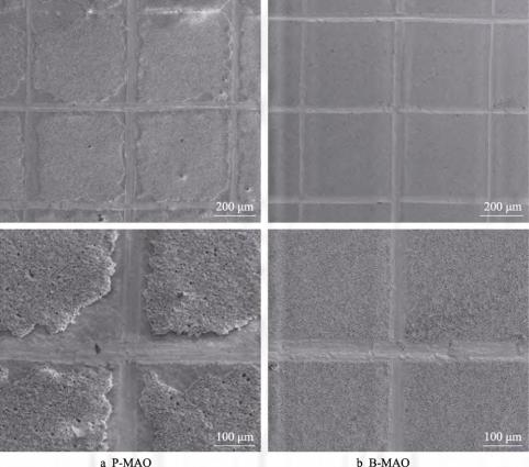 图 4 十字划格试验后 P-MAO 和 B-MAO 涂层表面切口的 SEM 形貌