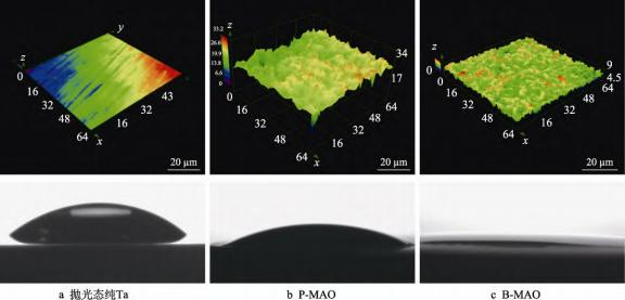 适宜的植入体表面粗糙度可促进更早、更强的骨整合,粗糙的表面是增强植入体与骨组织接触面积以及骨组织向内增长的潜力,并且成骨细胞对粗糙的表面有更好的附着能力[34-35]。使用激光共聚焦显微镜测量出的不同样品表面的三维轮廓如图5所示。粗糙度测量结果显示,机械抛光纯钽的Ra=0.06μm,P-MAO涂层的Ra=1.50μm,B-MAO涂层的Ra=1.58μm。说明B-MAO和P-MAO表面均为粗糙表面,均高于机械抛光纯钽,而且B-MAO表面的“类骨小梁”状多孔结构的粗糙度高于P-MAO表面。