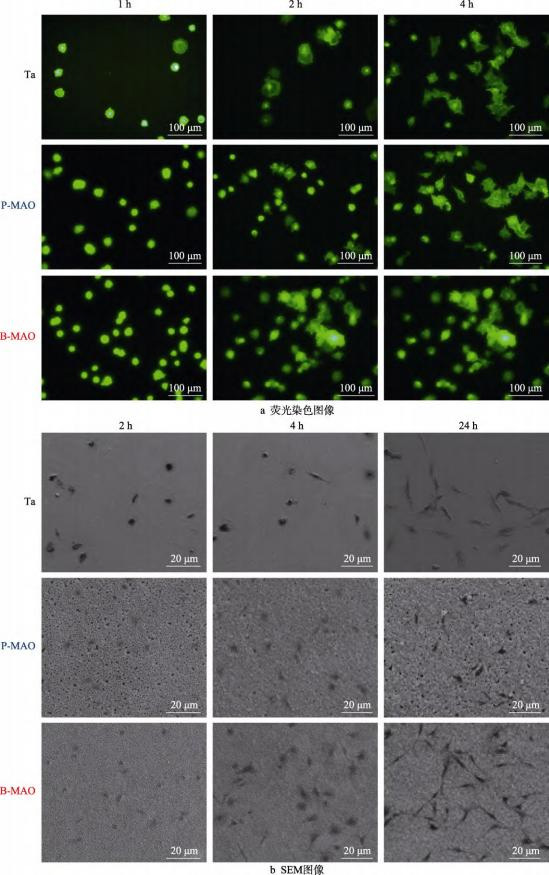 细胞在纯Ta、P-MAO和B-MAO表面培养1、2、4h后的荧光染色图像如图6所示。1h时,在3种形貌表面细胞均呈现圆形,且P-MAO和B-MAO涂层表面的细胞数量多于Ta表面细胞数量,说明初期P-MAO和B-MAO涂层的细胞粘附能力高于抛光Ta。随着时间的增加,细胞逐渐在表面铺展,且在2h时细胞形态发展为多边形,部分细胞有伪足出现。4h时,细胞伪足进一步扩展,丝状伪足增多。说明前期纯Ta表面、P-MAO和B-MAO涂层均具有良好的细胞铺展性能。图6b为细胞铺展的SEM形貌图像,通过观察可进一步对比表面结构对细胞铺展及粘附的影响。2h培养的SEM图像中,B-MAO相较于P-MAO细胞粘附数量较多,并且在4h时,B-MAO细胞形貌出现了明显的变化,伪足数量较多。在较长的24h时间点上,B-MAO涂层表面细胞铺展已经比较充分,且B-MAO涂层的细胞铺展能力优于P-MAO涂层和抛光纯Ta表面。Fiedler等[39]研究认为,不同的表面结构会使得细胞膜上的肌动蛋白纤维产生不同的应力,进而有不同的铺展速度。本文B-MAO表面相较于P-MAO表面更有利于细胞丝状伪足的延伸与铺展,应该与其独特的“类骨小梁”状分级多孔结构有关。