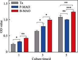 图 7 Ta 、P-MAO 和 B-MAO 表面在 1 、3、5 d 时的 CCK-8 法细胞增殖能力测试( ns p>0.05,* p<0.05, ** p<0.01, *** p<0.001, n=3 )