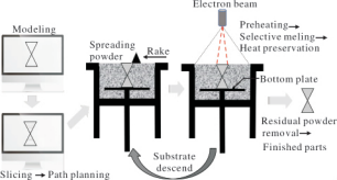 采用赛隆公司自主研发的S2型粉末床电子束3D打印设备进行样品成形。该设备主要由电器控制柜、电子枪和电源、真空成形室、送铺粉机构、真空系统等组成,最大成形尺寸200mm×200mm,最大熔化电流50mA,最大跳转速度8000m/s,加速电压60kV,电子束束斑直径≤200μm,零件成形精度±0.3mm。设备打印原理如图2所示。