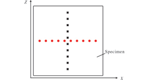 成形Nb521合金样品经研磨、抛光后,用HCl+HNO3+HF混合酸液(体积比2∶2∶1)腐蚀,采用金相显微镜观察试样横向和纵向显微组织。采用化学分析法测定成形样品的化学成分。采用排水法测量样品的密度。通过X射线衍射仪分析样品的物相结构。采用Instron-5982万能试验机测定成形样品的室温拉伸性能。去除成形样品外表疏松层(约0.7mm),表面经打磨、抛光处理后,采用显微硬度仪测量样品沿堆积高度方向和堆积层面的显微硬度,测试点间距为1mm,载荷1.96N,加载时间15s。图4为显微硬度测量点示意图。