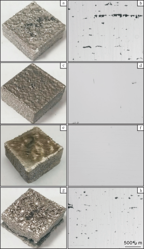 E=IU/(vht)(1)式中:I为熔化电流;U为加速电压,60kV;v为熔化速度;h为熔化间距;t为铺粉层厚。本研究中保持层厚及熔化间距不变,Nb521合金成形质量主要由熔化电流与熔化速度两个参数决定。图5为不同电子束能量密度下Nb521合金样品的宏观照片及内部缺陷形貌。从图5可以看出,随着电子束能量密度的增加,打印样品熔化质量从欠熔到良好,再到过熔状态。欠熔状态样品内部因熔池深度有限,层间结合不良,导致有较多沿层面分布的缝状缺陷;过熔状态下,能量输入过高,容易出现局部过热,熔池稳定性欠佳,易产生缩孔等缺陷。熔池能量密度为340J/mm3时,具有最佳的熔合质量,视野范围内未见裂纹、熔合不良等缺陷。