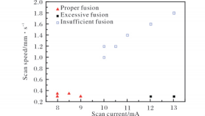 (1)采用SEBM成形Nb521合金,当电子束能量输入密度为340J/mm3时,基本消除了熔合不良缺陷,成形样品密度达到8.78~8.79g/cm3。