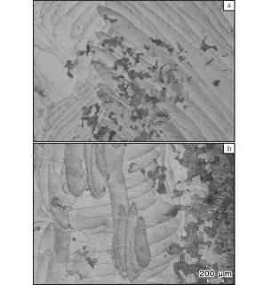 图8a为成形样品垂直于沉积方向的沉积层面显微组织。图8a中除可见的大尺寸柱状晶外,还不均匀分布着少量等轴晶,晶粒尺寸在20~100μm之间不等。针对这一现象,对成形样块的边缘部分进行了显微组织分析,发现靠近边缘部分同样为等轴晶组织(图8b)。这种现象可能与边部热量扩散快,温度梯度大,晶粒没有继续长大的条件有关,而存在于样块内部的等轴晶,可能与温度场分布不均匀有关。