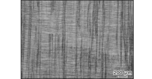图7是电子束选区熔化成形Nb521合金样品纵向截面(即沿沉积方向)的显微组织。SEBM成形样品的晶粒呈由底部生长的柱状晶,柱状晶几乎贯穿整个沉积高度方向,柱状晶的宽度在5~100μm之间不等。图7中层与层之间的层带结构明显,该层带结构是熔池与已凝固层的界面,为道次/层次的形成痕迹。