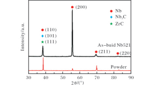 (4)SEBM成形Nb521合金样品沿(200)晶面有较强的择优生长取向。成形样品中除Nb基体相外,还存在少量Nb2C、ZrC碳化物析出相。