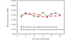 分别测试了Nb521合金试样沿堆积垂面方向(Z向)和沿堆积层面内(XY平面)的显微硬度分布,结果见图11。从图11可以看出,无论是垂面还是层面内,其显微硬度均处于1500~1700MPa之间。样品显微硬度测量值均未随测点位置变化而出现较大波动,显微硬度表现为各向同性。