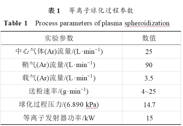难熔金属由于其具有较高的熔点、优异的耐高温性、耐腐蚀性能以及抗辐射性能而被广泛应用于航天航空、国防军工和核电工业等多个领域[1]。钨和钽在电力照明行业和电容电气领域的应用开启了难熔金属工程材料应用的新纪元[2]。作为典型的难熔金属,钨(熔点为3410℃)由于具有优异的高温机械性能、良好的导热性、较低的热膨胀系数以及较高的电子发射系数,在航空、高温结构和电子工业领域有着广泛的应用[3−5]。与钨相似,金属钽也具备较高的熔点(2996℃),并且由于其具有良好的耐腐蚀性、较强的抗电子迁移能力和良好的生物相容性而被广泛应用于化工领域、电子工业领域和生物医用领域[6−8]。与传统的制备方法相比,3D打印是一种高效率、高精度和高原料利用率的制造成型技术,能满足难熔金属复杂结构件及超细晶组织的要求,这进一步拓宽了难熔金属材料的应用领域[9−12]。3D打印对原料粉末的流动性和氧含量均有较高的要求,因此,需对不规则钨粉和钽粉的球化工艺进行研究[13−15]。