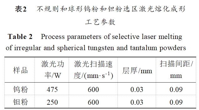 所用原料粉末为四川自贡硬质合金有限公司生产的钨粉和长沙南方钽铌责任有限公司生产的钽粉。采用射频等离子球化仪(加拿大TEKNA公司生产的TekNano-15型号)对不规则钨粉和钽粉进行球化,实验参数如表1所示。采用华曙FS271M3金属3D打印机对球化前后的钨粉和钽粉进行选区激光熔化成形(SLM),SLM工艺参数如表2所示。