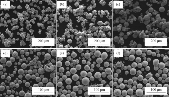 (a) 原始钨粉;(b) 25 g/min;(c) 15 g/min;(d) 10 g/min;(e) 6 g/min;(f) 4 g/min