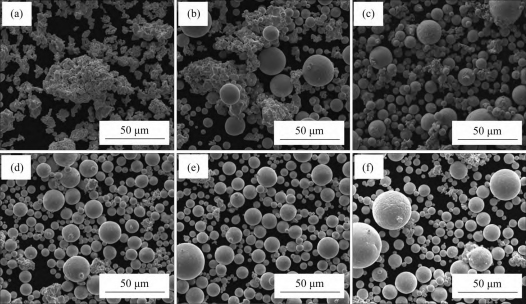 图1和图2所示分别为原始钨粉和钽粉及不同送粉速率下球化钨粉和钽粉的SEM图片。图1(a)和图2(a)所示分别为不规则的原始钨粉和原始钽粉,均表现出严重的团聚和黏结。从图1(b)~1(f)和图2(b)~2(f)可以看出:送粉速率显著地影响球化后的金属粉末形貌;当钨粉和钽粉的送粉速率大于10g/min时,视野中球形钨粉和钽粉的含量较少,不规则粉末的含量较高,粉末的团聚现象较为明显。这主要是因为送粉速率过快,单个钨粉和钽粉颗粒吸收的能量不足以使之完全融化。从图1(d)和图2(d)可以看出:当送粉速率下降到10g/min时,球形钨粉和钽粉增多,粉末团聚现象明显减少;当钨粉和钽粉的送粉速率分别下降到6g/min和8g/min以下时,大部分钨粉和钽粉均被球化,且颗粒分布均匀,团聚现象基本消失。使用Image-ProPlus(IPP)软件统计钨粉的球化率。当钨粉和钽粉的送粉速率分别为6g/min和10g/min时,钨粉和钽粉的球化率均超过95%;当钨粉送粉速率超过6g/min时,钨粉的球化率明显降低;当钨粉送粉速率超过15g/min时,钨粉的球化率低于50%。此规律在钽粉的球化过程中也适用。