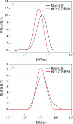 (a) 原始钨粉和最佳送粉速率球化后的钨粉; (b) 原始钽粉和最佳送粉速率球化后的钽粉