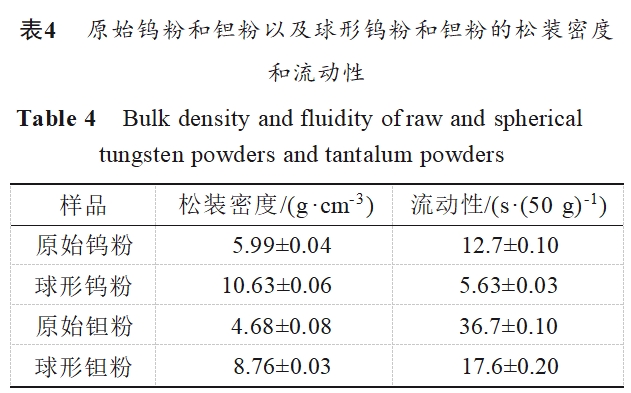 为了研究粉体的球化率对流动性和松装密度的影响,用流动仪测定原始钨粉和钽粉以及图2中球化率超过95%的钨粉和钽粉(后面简称球形钨粉)的流动速度和松装密度,测定结果如表4所示。从表4可以看出:球化处理后,粉体的流动速度和松装密度均显著提高。原料粉体在球化后,颗粒的形貌由极不规则的形状变为球形,颗粒之间的接触面积小、颗粒之间的摩擦阻力降低,颗粒堆积较密实。