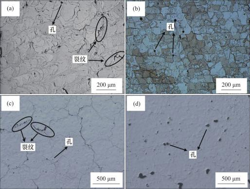 图5所示为球化钨粉、钽粉和原始钨粉、钽粉的选区激光熔化后的光镜图片。从图5可知:在相同参数下,使用原料粉末制备的样品表面存在大量微裂纹、气孔等冶金缺陷。图5(a)和5(b)所示分别为原始钨粉和钽粉SLM成型获得样品的正表面图,可见表面存在大量裂纹,并且钨块表面的裂纹分布几乎平行于激光扫描方向,而钽块表面的裂纹主要是沿着晶界分布。由于激光扫描时,两道激光接触部位温度高,热应力大,不规则的粉末在激光熔化下,在激光接触部位可能会存在未熔部分,因此易产生裂纹源。通常,裂纹会沿着激光扫描方向扩展,因此,在每道激光接触部位存在大量裂纹。而由于激光在扫描过程中,原始粉末的形状不规则,堆积时不均匀,导致激光扫描中心熔池不稳定,可能有孔洞和未溶颗粒存在,造成缺陷,这些缺陷在快冷造成的热应力下容易在结合较弱的晶界处产生裂纹源,而激光熔池从中心到两边温度逐渐降低,因此,裂纹会沿熔池中心向两边扩展,裂纹扩展连接多道熔池,扩展成宏观裂纹。孔洞形成的原因是原始钨粉在铺粉过程中,由于颗粒粒径、形状不一,并且原始钨粉颗粒较大,在扫描当层形貌时,铺粉过程中钨粉堆积不均匀,出现颗粒未熔现象,导致形成孔洞。图5(b)和5(d)所示分别为球形钨粉和钽粉末制备的试样的正表面金相图,可见以球形钨粉和钽粉为原料,选区激光熔化成形的样品表面孔隙较少,只有极少数小孔隙,裂纹基本消失。在球形粉末激光成形过程中,由于粉末堆积缝隙小,粉末铺粉均匀,因此,在激光扫描过程中基本没有未熔颗粒,产生的缺陷较少[25-27]。