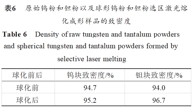 测量球化前后SLM成型的块体钨和块体钽的密度,然后用测量获得的实际密度除以理论密度,得出块体钨和块体钽的致密度如表6所示。从表6可见:在球化后的钨块和钽块的致密比球化前的块体的致密度有明显上升。