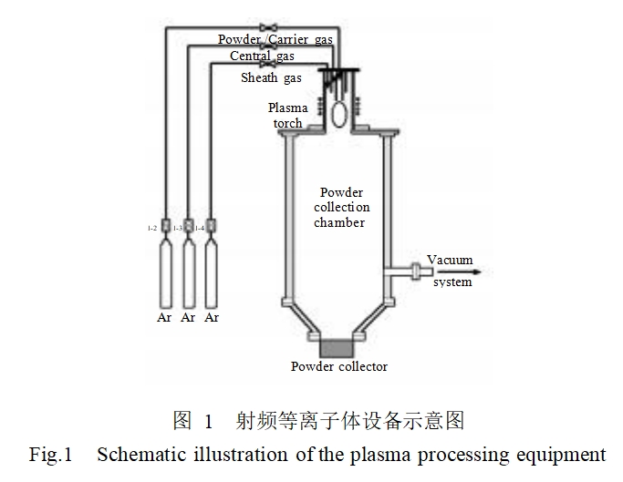 实验采用费氏粒度为5.5,11.5,26.5μm的钨粉为原料,粉末形状为不规则形。用于制备球形钨粉的射频等离子体装置,主要包括射频感应等离子发生系统,频率为3.5MHz,额定功率为100kW;冷却室,喂料系统和产品收集系统,如图1所示。