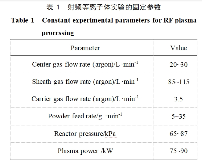 射频等离子体具有温度高(约104℃)、等离子体炬体积大、能量密度高、传热和冷却速度快等优点,是制备组分均匀、球形度高、缺陷少、流动性好的球形粉末的良好途径[10-12]。以等离子体为热源,在难熔金属球化处理方面具有较大的技术优势[13]。射频(RF)等离子体在球化处理粉末的过程中,其高温提供的足够能量使粉末在穿越等离子体时迅速吸热、熔融,并在表面张力作用下缩聚成球形,在极短的时间内骤冷凝固,从而形成球形的粉末。等离子熔融球化技术被认为是获得致密、规则球形粉末的最有效手段之一。