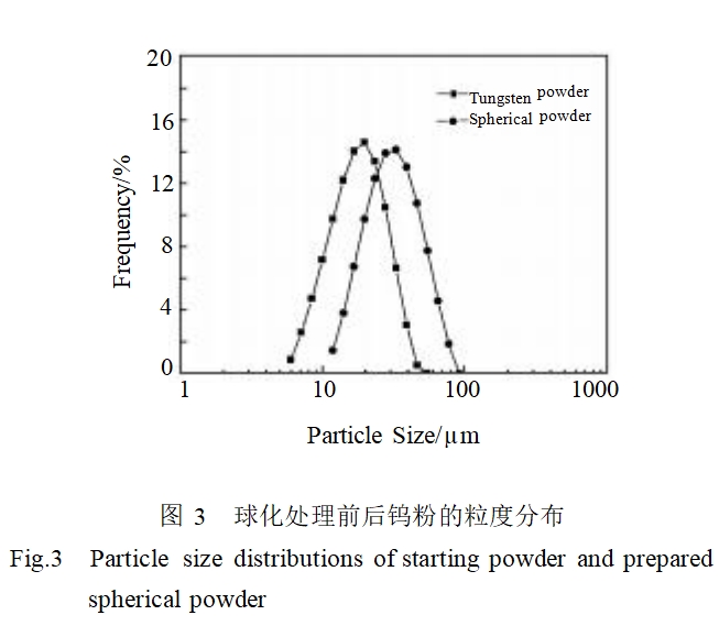 1)通过射频等离子体处理技术可以得到单相球形钨粉。球形钨粉表面光滑、球形度好,球化率可达100%。球化处理后,钨粉粒度略微增加。