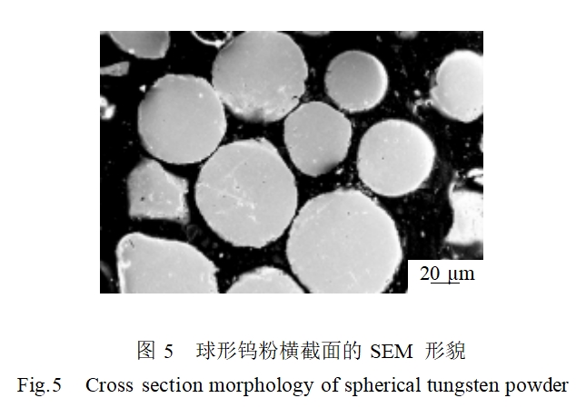 图5为球形钨粉(26.5μm)截面的SEM照片。由图可知,原钨粉的不规则形状的棱角已消除。球形钨粉的内部结构致密,说明粉末在等离子体球化处理过程中充分吸热,表面或整体熔融,实现粉末的致密化。球形粉末长径比接近1:1,粉末的球形度良好,为规则的球形。