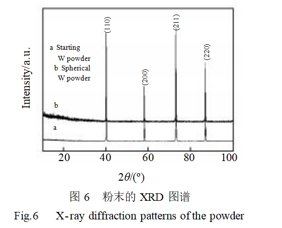 射频等离子处理前后钨粉的XRD图谱如图6所示。由XRD图谱可知,球化后的钨粉衍射峰的位置与原料钨粉一样,并没有发生变化,其特征衍射峰(110),(200),(211)和(220)表征粉末为体心立方(bcc)结构。球化前后都呈单一的W相,没有出现其它杂质相的特征衍射峰。采用氩气作为等离子体工作气,经射频等离子体球化处理后可以制备单相钨粉。