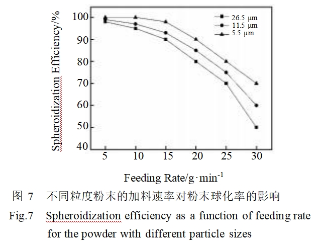 从图7还可以看出,当加料速率一定时,球化率随粉末的粒度增加而降低。粒度较小的粉末,其比表面积较大,穿越等离子体时吸收热量更充分,有利于粉末的球化。一般来说,随着粉末粒度的减小,其熔点也降低,吸收同样的能量更容易球化。因此,相同的工艺参数下,较小粒度的粉末球化率更高。