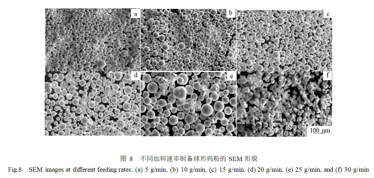 2)加料速率是影响粉末球化率的重要因素。在相同工艺参数下,随着加料速率的增加,钨粉的球化率降低。粒度较小的钨粉的球化率较高。
