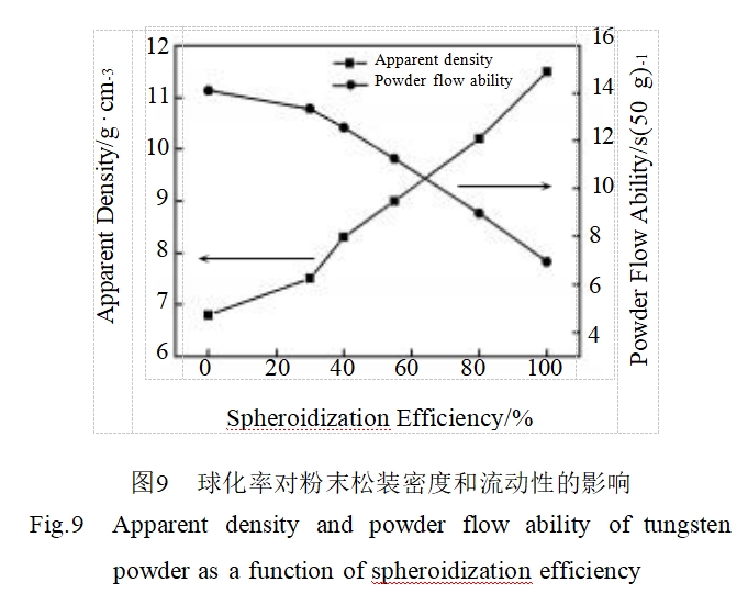 图9为26.5μm钨粉球化率对粉末松装密度和流动性的影响。由图可知,随着钨粉球化率的提高,松装密度也逐渐得到提高,粉末流动性得到很大改善。当钨粉的球化率从0增加到100%时,粉末的松装密度由原料粉末的6.80g/cm3增加到11.5g/cm3,粉末流动性由14.12s/50g提高到6.95s/50g。