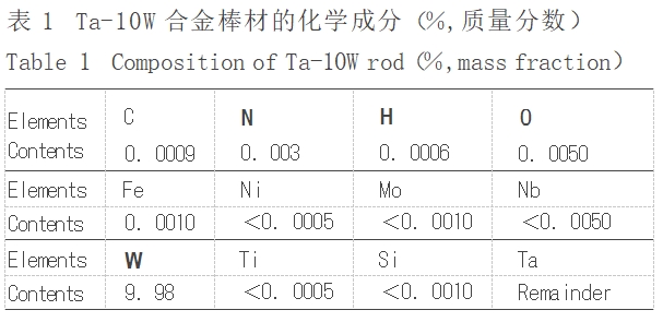 试验所用Ta-10W合金棒材是经真空电子束二次熔炼的铸锭(铸锭尺寸Φ97.5mm),经过热模锻结合冷拉拔加工至Φ14mm,再进行真空再结晶退火,然后车削加工成试样。试样的金相组织见图1,试验所用材料的化学成分见表1。