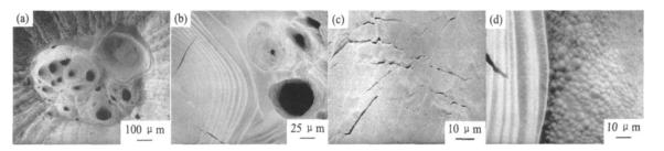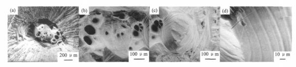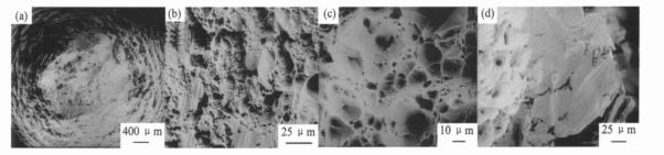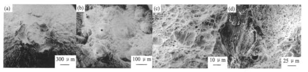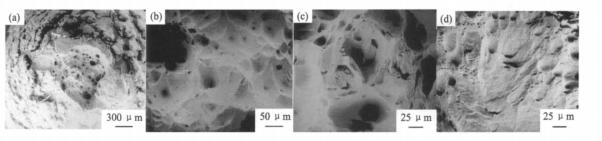 1200℃的高温断口形貌照片见图6。该温度时的韧窝较1000℃时的增大、增深,说明材料的塑性随温度的提高而提高。韧窝底部有夹杂(图6(c)),可能成为裂纹源。
