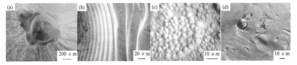 2000℃的高温断口形貌见图10。原来普通的韧窝消失,仅有新型的环形“韧窝”单独存在,并占据了试样的中心。在环形底部平台上可见夹杂物(图10(d)),电子探针分析的结果显示为Al,O的夹杂。此时,断面收缩率没有下降,仍然处在最高的平台上,延伸率比1600℃时稍有下降,与1800℃处在同一平台上(图3)。