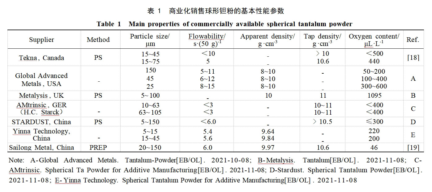 随着增材制造装备的成熟以及难熔材料复杂构件需求的增加,2015年开始各国科研机构及粉末制造企业先后投入了大量精力用于球形钽、钨以及钼等难熔金属粉末的工艺开发[15-17]。表1给出了各国相关企业商业化销售的球形钽粉的基本性能参数。可以看出,球形钽粉的制备主要是采用等离子球化(plasmaspheroidization,PS)和等离子旋转电极雾化(plasmarotatingelectrodeprocess,PREP)技术。