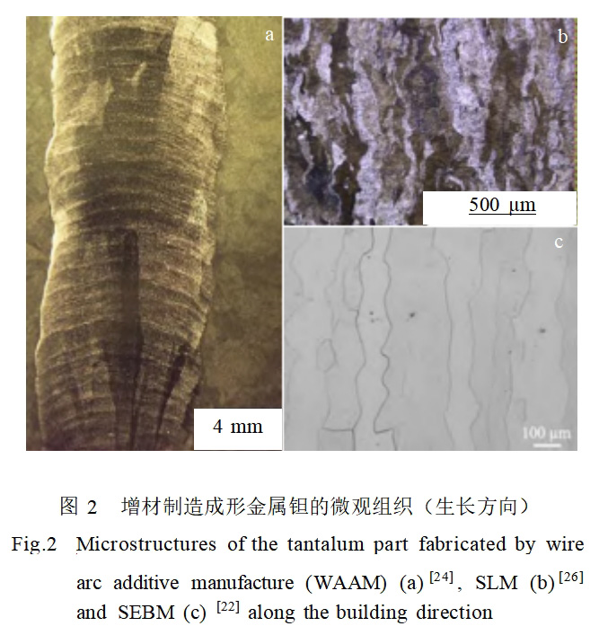 图2给出了增材制造工艺制备的金属钽的微观组织。可以看出,通过工艺参数的优化,现阶段增材制造技术制备的钽金属内部缺陷得到了有效控制,致密度均可达99.9%以上[18,22,24-27]。与大多数增材制造制备的金属材料相同,金属钽的微观组织同样表现为沿生长方向外延生长的粗大柱状晶结构。其中,SEBM技术成形材料柱状晶的特征最为明显,如图2c所示,柱状晶的宽度为165.22±3.44μm[22]。