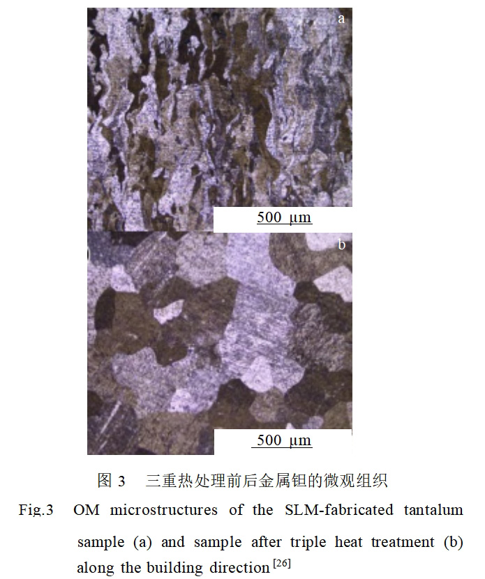 Zhou等人[26]近期的研究结果表明,SLM技术成形的金属钽在经过三重高温退火后,其组织将由粗大的柱状晶转变为等轴晶,这对于消除增材制造金属材料各向异性至关重要,如图3所示。作者认为是由于高温退火消除了SLM成形件内部巨大的内应力,同时位错运动在高温下被充分激活,发生的位错滑移或攀移为柱状晶向等轴晶的转变提供了必要条件。