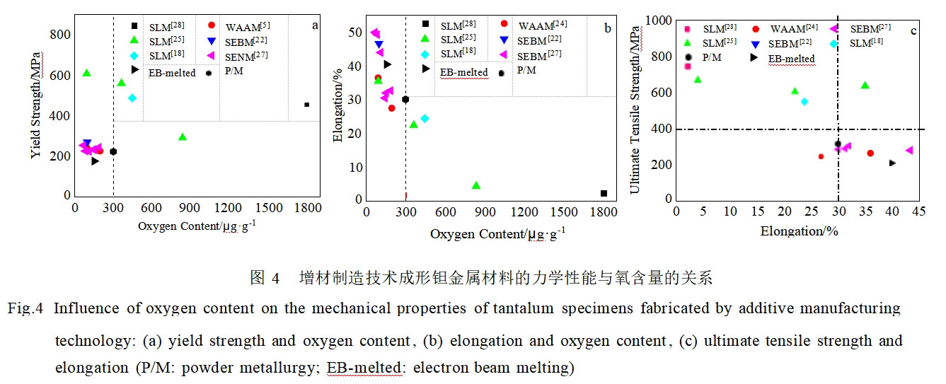 图4分析了增材制造金属钽材料的室温力学性能。按照相关材料标准,氧含量300µg/g是钽中氧含量的上限。因此,为了系统说明增材制造钽金属的力学性能,在图4a,4b中分别列出了屈服强度和延伸率与氧含量的关系。可以看出,由于研究初期粉末制备技术的原因,部分增材制造钽金属的氧含量超过了标准规定的上限。另一方面,SEBM技术所用粉末氧含量较低,材料的屈服强度与传统工艺基本吻合,而SLM制备的钽金属屈服强度的分散性较大。例如,氧含量1800µg/g的钽金属[28]屈服强度要低于低氧含量的情况[18,25],这是可能由于成形样品内残余的孔洞缺陷导致的致密度不足引起的。