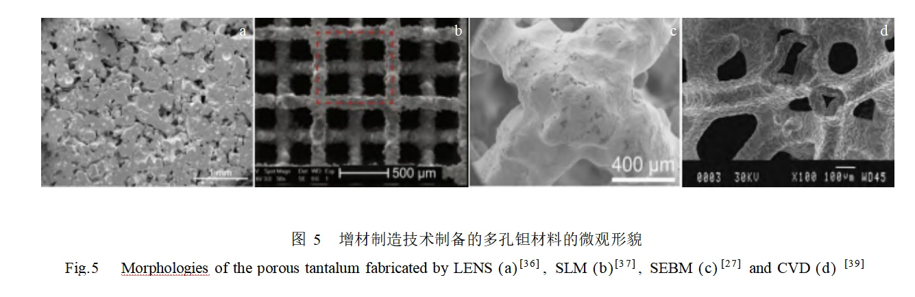 表2列出了现有文献报道的多孔钽材料的结构与性能,并与Zimmer公司采用CVD技术制备的多孔钽材料进行了对比。可以看出,增材制造技术制备的多孔钽材料,其孔结构形式主要包括:1)随机型孔结构(stochasticstructure,SS),如图5a所示。通过工艺参数控制,采用高能束将粉末材料部分熔化,即利用粉末颗粒间的缝隙形成三维联通孔隙;2)规则有序型孔结构,也可称为点阵结构(latticestructure,LS),如图5b,5c所示,是以杆或板以按类似晶体点阵结构的方式构筑而成的多孔结构。随机型孔结构是通过工艺参数的改变来实现孔隙参数的调整,其孔隙率和孔径的可控范围较窄。相比之下,点阵型有序孔结构,在增材制造钛合金骨科植入物中已经获得验证,可以自主的设计孔结构和孔径尺寸,与个性化诊疗的概念完全契合[40]。因此,采用增材制造技术不但可以实现与Zimmer公司多孔钽材料(图5d)相同的孔结构,通过改变三维模型设计,还可以实现孔结构参数与力学性能的按需调控。