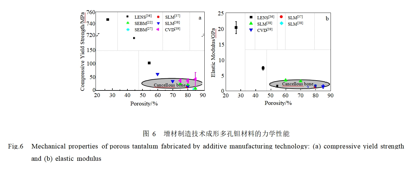 力学性能是医用金属材料的最为重要的技术指标之一。足够的强度可以为组织长入提供支撑,合适的弹性模量可以有效地降低应力屏蔽,从而有力促进植入体的初期稳定性。图6对表2中的力学性能进行了分析,在同等密度条件下,增材制造技术制备的多孔钽强度要低于CVD技术,但二者均达到了人体松质骨的强度,如图6a所示。强度差异是由于CVD制备的多孔钽中残留有1%(质量分数)的碳[39],导致其强度远高于纯钽。根据Gibson和Ashby等人[41]的研究,多孔金属材料相对密度和强度之间存在一定的对应关系,可以用于指导个性化多孔植入体的结构设计[38,42]。但目前公开报道多孔钽材料的力学性能数据较少,尤其是弹性模量数据。