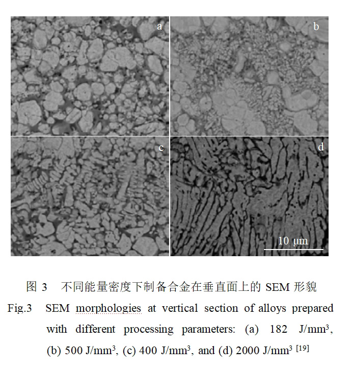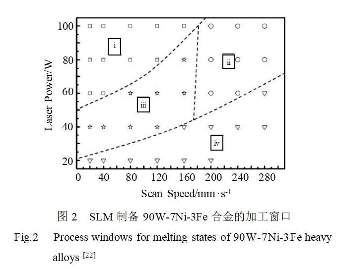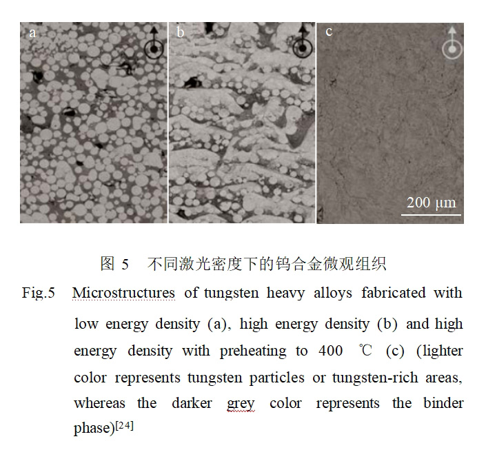Wang[23]等人研究了激光扫描迹线宽度、激光功率和扫描速度等激光参数对SLM制备的90W-7Ni-3Fe合金的致密度影响。研究表明,90W-7Ni-3Fe合金的致密度同时主要受W颗粒的重排以及W的溶解-析出过程控制,同时激光功率和扫描速度对其致密度影响显著,通过工艺参数优化,其制备的90W-7Ni-3Fe合金最大致密度可达94.5%。