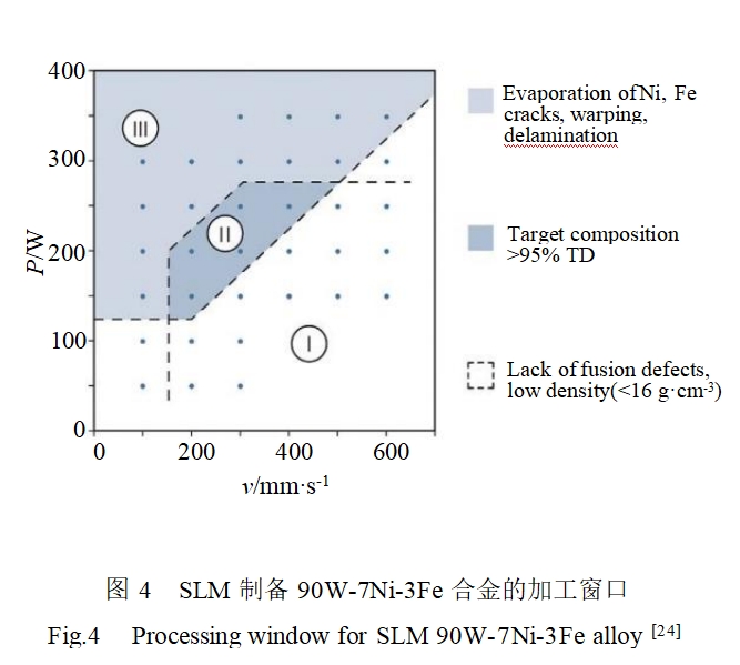 Alja?Ivekovi?[24]等人研究了激光能量密度、预先加热、后热处理对SLM制备90W-7Ni-3Fe合金组织与性能的影响,也发现随着激光能量密度的增加,90W-7Ni-3Fe合金的成形机制从LPS向部分熔化到完全熔化转变,其加工窗口如图4所示,成形钨合金的组织分别如图5所示。当能量密度过低时,成形钨合金的密度较低,且Ni-Fe粘结相含量比初始粉末组成更高。在较高的能量密度下,特别是在400℃预热下,Fe和Ni的气化使成形合金富W且极易开裂。在中等能量密度下,即W颗粒部分熔化时,成形的W-Ni-Fe合金具有高强度(抗拉强度为871±30MPa)低塑性(延伸率<1%)的性能。对该成形样品进行了类似重新LPS的高温退火处理(1500℃,保温30~60min),合金的显微组织和性能(抗拉强度为850±21MPa,延伸率为(10.2±1.0)%)可与传统LPS方法制备的零件相当。