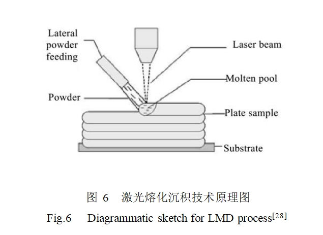 LMD技术(技术原理如图6所示)起源于激光表面熔覆技术[28],同时结合快速原型制造技术,利用高能量密度激光将同步送达的金属粉按规划路径进行熔覆,单层熔覆完成之后,将激光头和送粉头抬升一定高度,重复层内熔覆过程,最终实现工件逐层熔化、快速凝固堆积成型。由于在该技术发展初期,各国研究机构独立开展了相关研究,导致这项技术拥有众多别称,如:激光近净成形(laserengineerednetshaping,LENS)、激光金属沉积(lasermetaldeposition,LMD)、激光立体成形(lasersolidforming,LSF)、受控激光制造(directedlaserfabrication,DLF)、金属直接沉积(directmetaldeposition,DMD)、激光固化(laserconsolidation,LC)、激光金属成型(lasermetalforming,LMF)、光控制造(directlightfabrication,DLF)、激光直接制造(laserdirectmanufacturing,LDM)、激光自由成型制造(laserfree-formfabrication,LFFF)[29]等。相较于SLM技术,LMD技术的成形效率较高,更适用于大尺寸零部件的制备。
