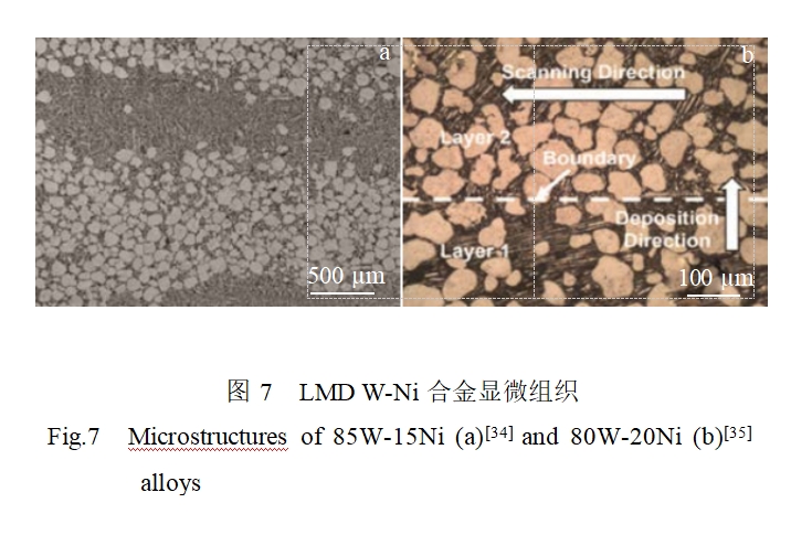 整体来说,国内外对于W-Ni-Fe系合金的增材制造研究仍处于发展阶段,当前的研究主要是基于激光或电子束增材制造技术开展。当采用激光或电子束作为热源时,由于其快速凝固的特点,增材制造的W-Ni-Fe合金可具有特殊的组织,如枝晶形W晶粒、粘接相中固溶W含量更高、W-W颗粒连接度更低、晶粒内部位错密度更高等,这些特征使得增材制造的W-Ni-Fe合金较传统LPS技术制备的W-Ni-Fe合金可具有更高的力学强度。但增材制造制备的W-Ni-Fe合金易产生内部微观组织分布不均匀,存在孔洞、裂纹等缺陷而导致其延性较差,制约了产品的应用。
