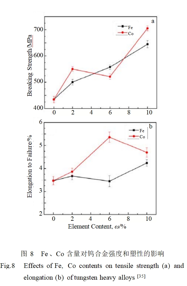 Wang等人[34,35]研究了W质量分数为80%~85%的W-Ni、W-Ni-Fe、W-Ni-Co合金的LMD成形,发现成形合金中W颗粒具有不规则形状和枝晶形状2种形态,而枝晶W主要存在于层间(如图7a所示),且随着激光功率的增加,枝晶状W颗粒所占比例增加;同时发现在粘接相中存在着细小的柱状晶,且柱状晶的生长方向在熔池底部时平行于沉积方向,在熔池顶部时平行于扫描方向(如图7b所示);随着Fe、Co含量的增加,试样的强塑性增加,且Co比Fe有着更好的提升力学性能的效果,如图8所示。